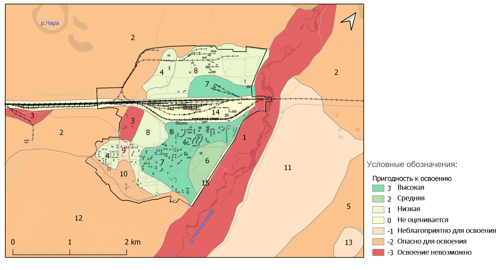 (!) Большая часть Чарской котловины непригодна для жизни.РЕЗУЛЬТАТС помощью спутниковых карт, геокриологического мониторинга, уточненных данных от мерзлотоведов на месте и других методов были созданы карты векторов освоения, схема ландшафтного зонирования. На основе последней была составлена схема пригодности к освоению – в ней подробно описывается, какую часть поселка можно использовать и с какой целью.